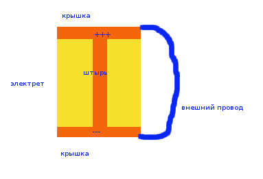Теперь, замыкая крышки синим проводом я ожидаю, что по нему потечет ток, выравнивающий потенциал крышек: сверху-вниз. Ибо снаружи электрета "поля нет". Но, поскольку попав на нижнюю крышку, электроны попадают в поле электрета, они будут перебрасываться им вверх, к "+". Откуда по внешнему проводу будут стекать вниз. То есть, по внешнему проводу и по штырям электрета потечет ток. И его сила будет определяться напряженностью поля электрета и суммарным сопротивлением провода и штырей, которое может быть достаточно мало.