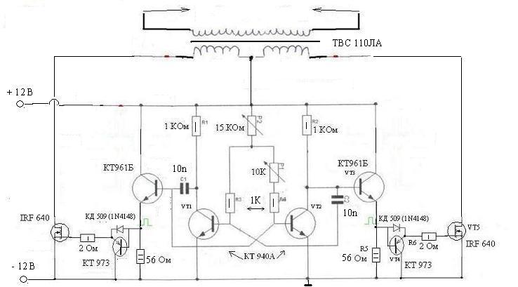 Вот еще одна САМАЯ ПРОСТАЯ схема преобразователя с параметрами лавинного открытия/закрытия транзисторов. Чем она мне наравится - легко регулируется частота/скважность и АБСОЛЮТНО не перегревается выходной транзюк. Детали - самые распространенные, можно выковырять из любого старого советского телевизора. Для регулировки скважности на базу Т2 ставится разделительный конденсатор.