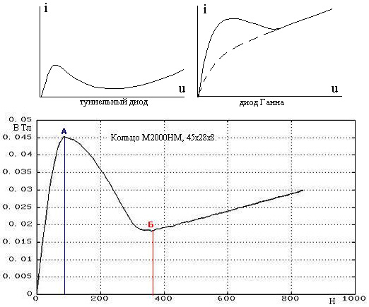 Позвольте вставить слово про отрицательное сопротивление. В моих книгах участок с отрицательным сопротивлением, насколько я помню, называют эквивалентом отрицательного сопротивления, или что-то около того. Такой участок есть на туннельных диодах и диодах Ганна. На них строят генераторы. Нужен только диод, батарея и сопротивление. Работают до ГГц. Год назад я обнаружил нечто похожее на такой участок на магнитопроводе, когда снимал характеристику B=f(H) в ветке про меги.
