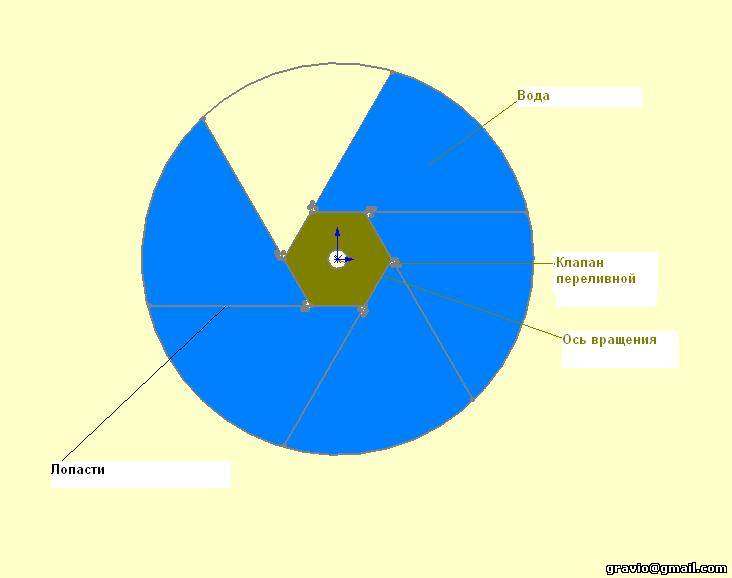 ну судя по рисунку если его не завращать против часовой стрелки он повернется по часовой, ибо там масса воды больше (справа). С другой стороны нужно чтобы вращался против часовой стрелки, даже при условии что мы зададим начальное вращение, нужно обеспечить достаточно быстрое переливание воды между секциями, иначе оно остановится. Мне так какжется