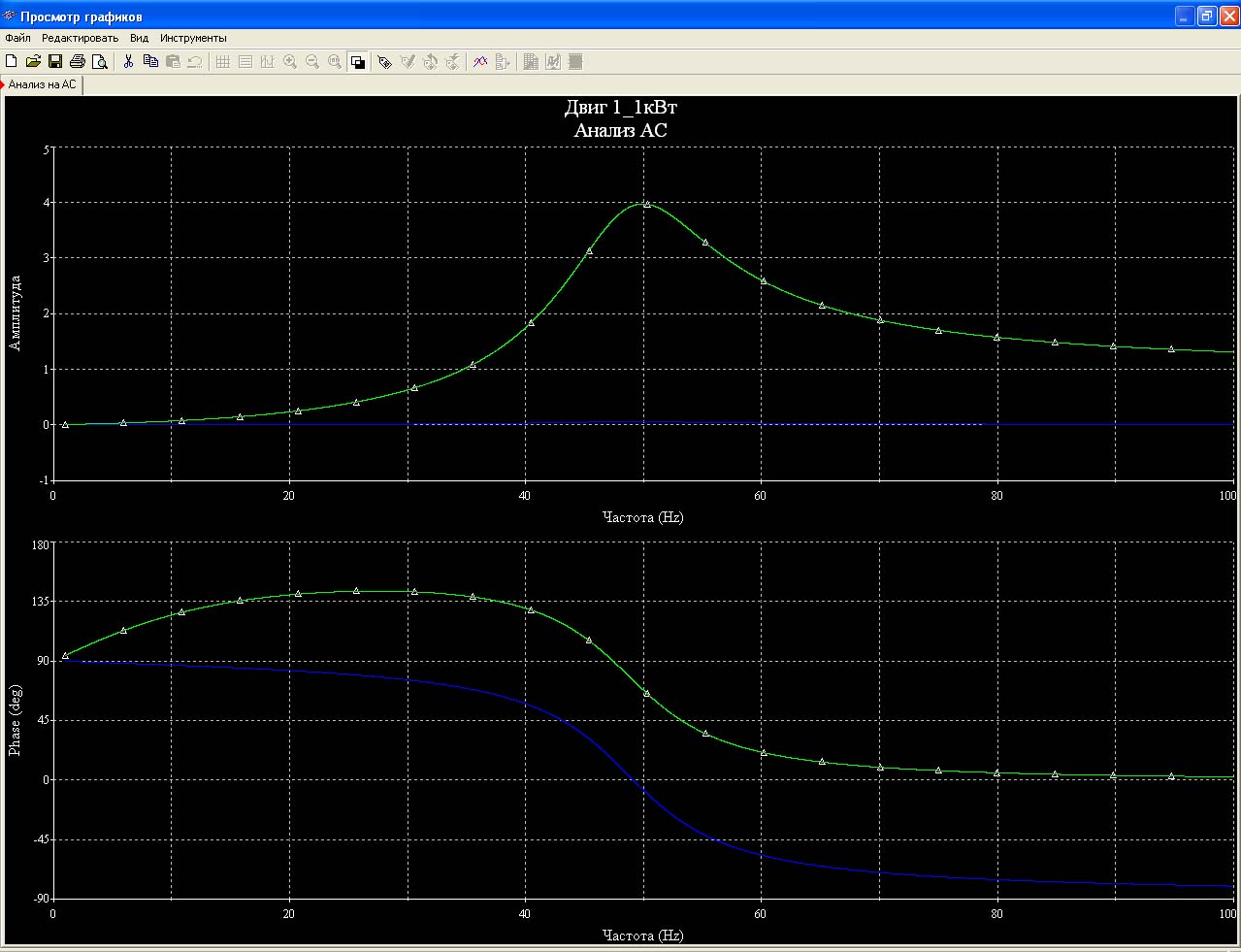 Вот графики. Зеленый - напряжение. Синий - ток. Верхний график - амплитуды, нижний - фазы.