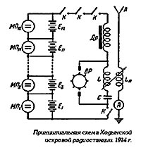 Ходынская искровая радиостанция имела мощность около 100 кВт и работала на волне 7000-9000 м. Схема радиостанции содержала последовательный LC контур, который заряжался от источника питания через дроссель Др, а затем замыкался накоротко в момент пробоя вращающегося искрового разрядника Р. Индуктивность контура L была связана с антенной катушкой LA, посредством которой затухающие колебания высокой частоты передавались в антенну. Искровой разрядник был выполнен в виде медного диска диаметром 0,7 м с массивными медными зубцами. Этот диск весил 500 кг и вращался со скоростью 1200 об/мин. Питание станции осуществлялось от 12 машин постоянного тока МП, соединенных последовательно и дававших суммарное напряжение около 12 000 В. Параллельно машинам были включены буферные аккумуляторы емкостью 54 А-ч каждый. Вся система электропитания была надежно изолирована от земли. Манипуляция передатчика производилась с помощью особого автоматического ключевого устройства К, одновременно разрывавшего цепь высокого напряжения в четырех местах. Дуга, возникавшая на контактах в момент их разрыва, гасилась сжатым воздухом. Радиостанции этого типа позволяли поддерживать связь Российскому Генеральному штабу со своими союзниками, входившими в состав Антанты.