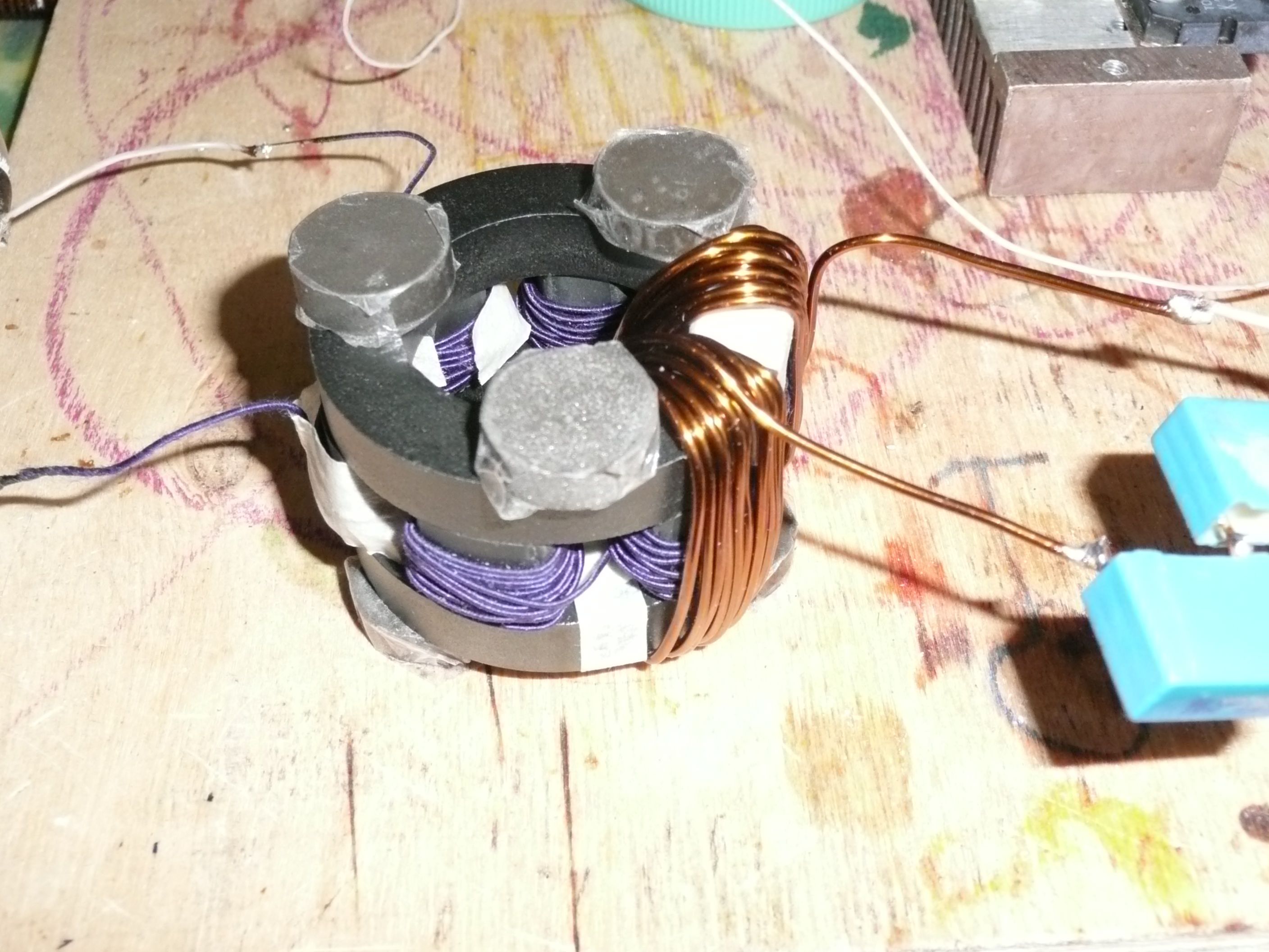 Работает как генератор, а не как трансформатор.Возбуждающая обмотка перпендикулярна выходной, напряжение с латра 80в, две лампы 75вт 220в последовательно,а вообще принцип описан в заявке..