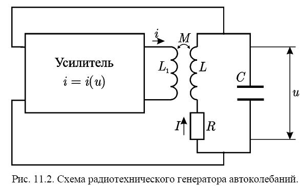 автоколебание в контуре испытывает случайные флуктуации. Они усиливаются усилителем и вновь поступают в контур через цепь обратной связи. При этом из шумового спектра флуктуаций будет выделяться составляющая на собственной частоте высокодобротного контура. Если энергия, вносимая в контур таким образом, превосходит энергию потерь, амплитуда колебаний нарастает. Для этого необходимо, чтобы коэффициент усиления был достаточно велик. Однако, поскольку зависимость ()iu (11.1) нелинейна, с ростом коэффициент усиления падает, что приводит к установлению стационарных автоколебаний с постоянной амплитудой, в чем и состоит механизм нелинейного ограничения неустойчивости. Таким образом, нелинейность в автоколебательных системах играет принципиальную роль, регулируя поступление энергии из источника. В линейной системе (например, осциллятор с отрицательным трением) амплитуда колебаний нарастала бы до бесконечности.