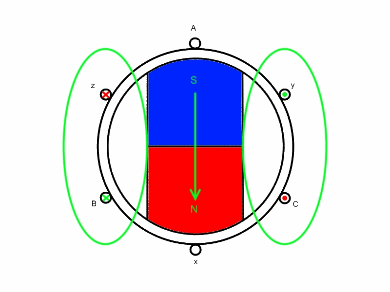 то нам необходимо расположить наши обмотки под углом 60 градусов, но при такой топологии трех обмоток вращающегося поля не получить, поэтому необходимо добавить еще три обмотки, но тут есть маленькое "но" чтоб получить вращающееся поле необходимо чтоб в дополнительных обмотках ток протекал в зеркальном отображении с основной, т.е. отстовал на 180 градусов.