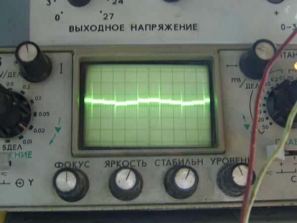 А теперь о грустном. Сердечник сперва не нагружал, просто повесил осциллограф на выводы стальной проволоки. Картинка импульсов, к сожалению, была одной и той же практически на всем диапазоне частот (см.фото- пички совпадают с началами запускающих импульсов с генератора), а вот амплитуда пичков не превысила 0,5 вольта. Соответственно, когда на выводы была прицеплена такая же лампочка 12В*0,1А, то она не зажглась, а картинка на осциллографе выродилась в сплошную горизонтальную линию.