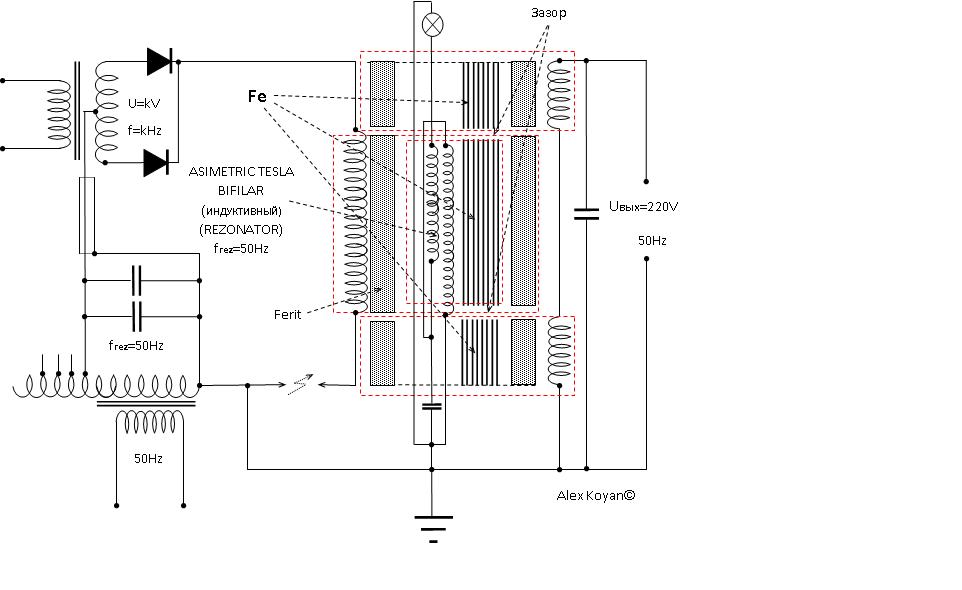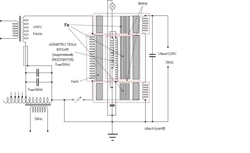 Если у Тесла его ТТ запитывался от железного транса, после которого был разрядник. Вся генерация основана на сдвигах в течении времени и более ни на чём!