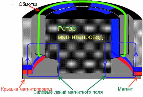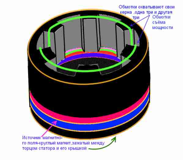 Как видно при вращений ротора магнитное поле статорного магнита будет замыкаться по пути наименьшего воздушного зазора между статором и ротором а этот путь при одном обороте ротора будет шесть раз изменять свою траекторию,проходя сквозь полюсные наконечники,на которых намотана или первая или вторая обмотка,возбуждая в них ЭДС.