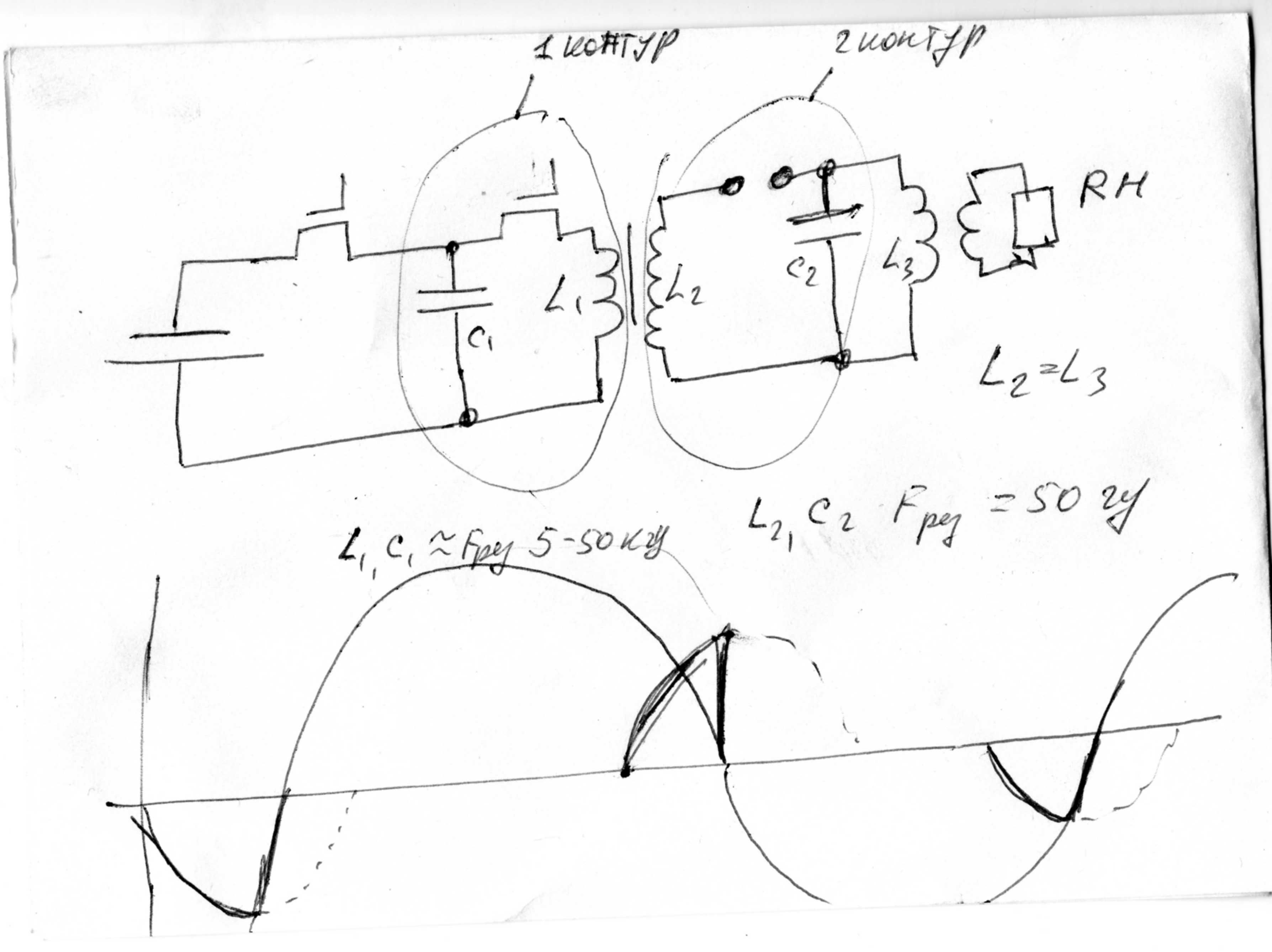 Привожу схему. она правда везде есть где только можно, итак принцип : имеется первый контур катушка и кондер .катушка первого контура намотана допустим на сердечнике для создания небольшой индуктивности (первичка как в бобине) паралельно ей кондер, резонансная частота этого контура допустим 5КГц т.е в 100 раз больше чем выходная 50 Гц. поверх первичной обмотки намотана многовитковая обмотка с большой индуктивностью это индуктивность второго контура настроенного на 50 Гц. Теперь кондер С1 заряжен допустим до 200 В разряжаем его через ключ и при достижении мах тока в катушке (первичной ) ключ запираем . Появляется мощьный импульс самоиндукции который пробивает разрядник в цепи второго контура (при прямом токе разряда кондера пробоя нет а значит ет и тока во вторичке ,так настроен разрядник) т.к. индуктивность в цепи второго контура большая то ток мгновенно прерваться не может и по инерции заряжает кондер . ток во вторичном контуре течет дольше чем в первом и его величина зависит от напруги возникающей во вторичной обмотке во время импульса самоиндукции и активного сопротивления обмотки второго контура. А так как скважность между импульсами первичной обмотки большая и определяется рез частотой второго контура то и затрачено энергии меньше чем на выходе.