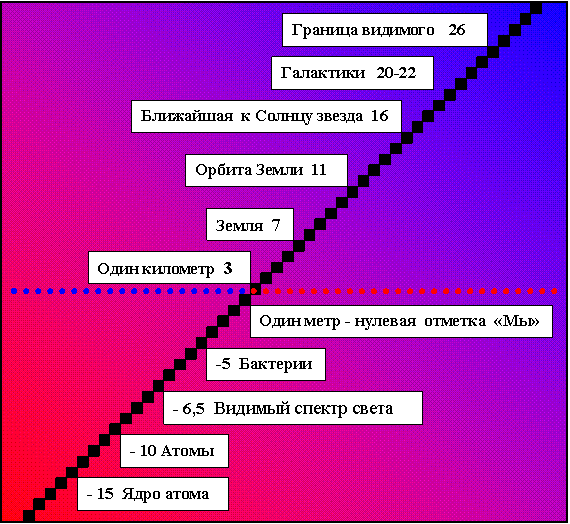 Общеизвестна в физической Картине Мира модель иерархии всех вещественных структур систем во Вселенной (атомов и молекул, планетарных и звездных систем), спроецированной на линейную шкалу, которая называется «квантовая лестница (КЛ)». Она покрывает размеры всего сущего, от наименьших измеренных внутриатомных расстояний до размеров всей Вселенной. Чтобы всю Вселенную нанести на карту, которая уместилась бы на одной странице, используется цена деления шкалы размеров систем, нанесенных в логарифмическом масштабе.