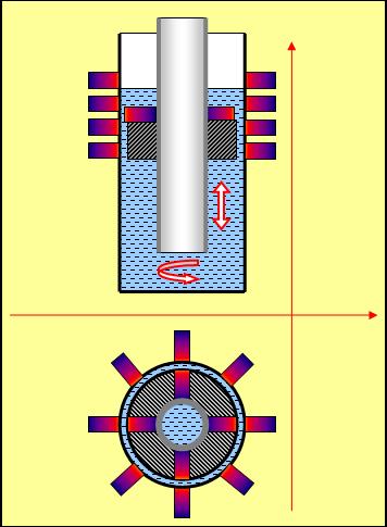 Жидкость (синяя заливка цветом) приобретает КИНЕТИЧЕСКУЮ энергию вращения и под действием даровых центробежных сил инерции перемещается радиально на периферию, освобождая место для падения вниз поплавка.