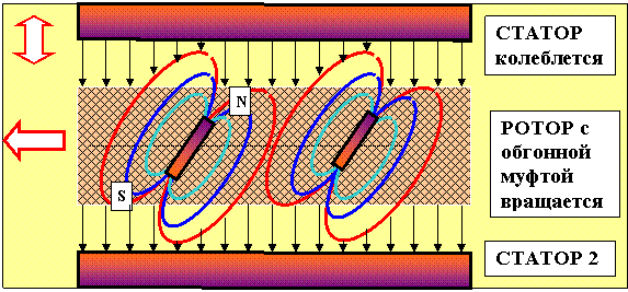 - в устройстве потенциальная энергия магнитного поля ротора и статора совершает работу циклично на два такта, соответствующих двум полупериодам колебания АКС, тем самым, магнитная энергия превращается в механическую, в кинетическую энергию вращения ротора.