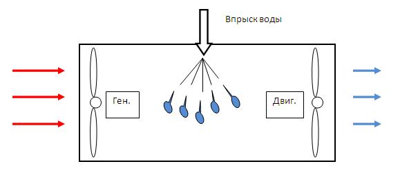Теперь через клапан вверху в центр трубы распыляем воду, вода начинает испаряться и забирать часть тепла от воздуха. Воздух при этом сжимается, что приводит к изменению скорости потока воздуха. Теперь на выходе из турбины имеем мы имеем ту же скорость V, а вот на входе скорость потока возрастет и будет равна V+z, турбина на входе начнет крутиться быстрее и как результат выдавать больше энергии. Причем эта дельта (наш z прироста) будет находиться в прямой зависимости от количества проходящего в единицу времени воздуха, то есть чем выше скорость в трубе тем выше дельта. При этом КПД системы от этого никак не изменится. Таким образом при каком то значении скорости потока в трубе мы превысим потери и получим полезную работу. В этот момент мы выкидываем нафиг наш генератор и мотор, соединяем турбины жестким валом на манер ТРД, мало того, постоянное разряжение внутри системы будет само подсасывать воду из емкости. На выходе получаем охлажденный воздух скажем 10С. Наш источник энергии живет в отобранных 10С.