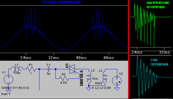 to Yarston В таком случае это только ЭДС самоиндукции первички, во время разрыва цепи тиристором. Как он при этом жив оставался, - загадка.