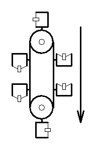 Имеем два барабана, на которых одета лента в виде кольца. На ленте жестко закреплено энное количество цилиндров (металл, пластмасса). Для простоты на рисунке изображено шесть штук. Вместо крышки - эластичная мембрана из тонкой резины. По центру мембраны укреплен груз. Вес груза, цилиндра, мембраны и заключенного в цилиндре воздуха должны соответствовать весу вытесненной ими воды при условии, что мембрана не деформирована давлением и гравитацией, воздействующей на груз. Просчитать и скорректировать вес не представляется сложной задачей.