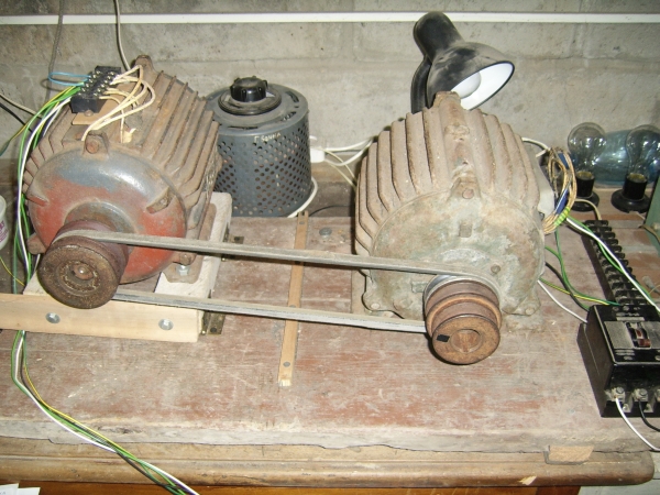 Насколько я понял, в установке идет речь о двух абсолютно одинаковых асинхронниках с КЗ-ротором, соединенных повышающей на 10% ременной передачей? Но странно тогда, что ни слова нет о возможном полезном выходе этой якобы генераторной установке. А вообще, интересный вариант ротовертера, но на три фазы.