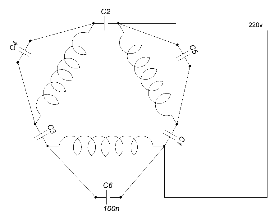Если выкинуть С1-С3 будет класический треугольник двигателя с треугольником конденсаторов(можно звезду кондеров, тогда емкость увеличиваем в 1,73 раза). При однофазном сьеме энергии будет перекос фаз, снимать лучше с трех сразу.У меня такая схема на мобильном ветряке была на речке летом.Но рыбы особой в схеме нет, классика.