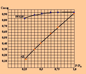 При недогрузке, коэффициент мощности АД, резко падает, попадая в область низких значений.