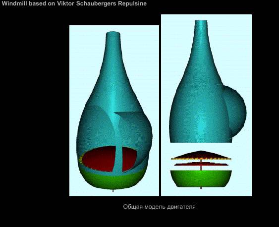 Вот рисунки, прототипы изобретения В.Шаубергера. Думаю и у Шестеренко использован тот же принцип прироста мощности в вихре через уменьшение объёма рабочего тела и использование энергии атмосферного давления.