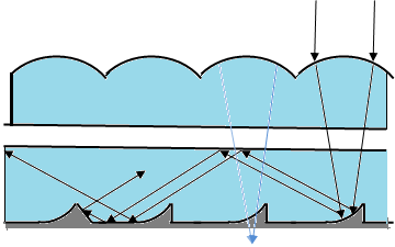 Свет проходит сквозь первое стекло, собираясь в сходящиеся пучки, входит, практически полностью, и в зеркало, но там попадает на параболические части, и отклоняется в сторону. Все - свет заперт 😀 С одной стороны зеркало, с другой - поверхность стекла, но под острым углом - тоже зеркало, В левой части рисунка нарисовал "клин" для возвращения света - излишен. Лучше как и остальные - перпендикулярно, тогда грани будут работать как катафоты, запуская свет под тем же острым углом, что и парабола "заслала" - дойдя до зеркального торца он один черт вернется. Вырваться из ловушки может только незначительная часть, что повторно попадет на параболы, но поигравшись с геометрией, можно этот процент к минимуму свести.