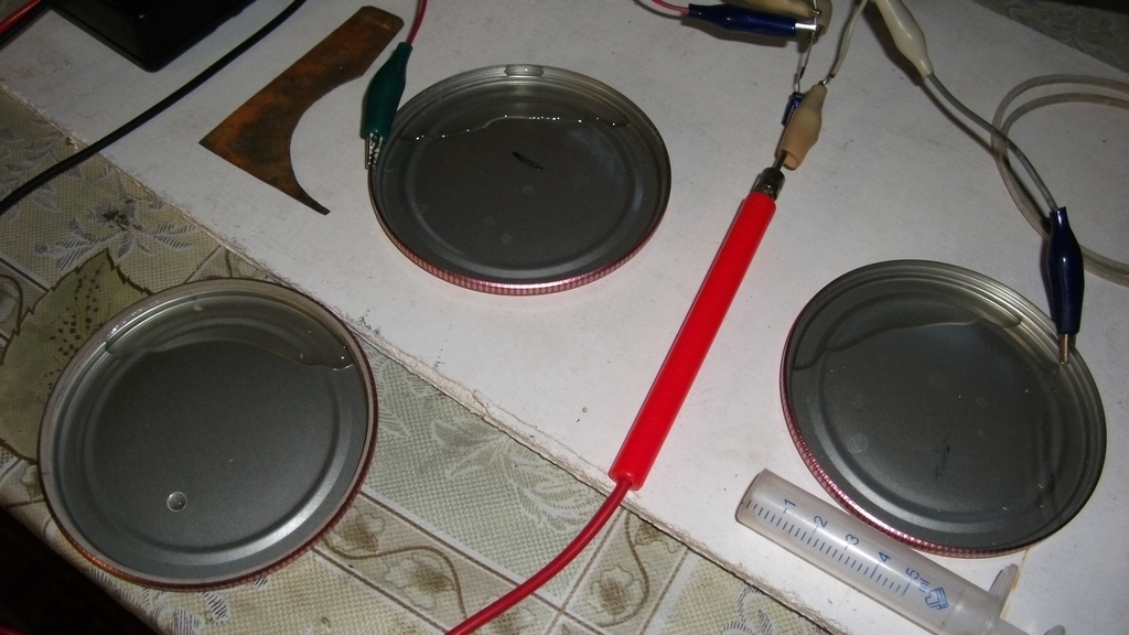 "Даваю" 😊. Напруга, приблизительно та же. Подключил АКБ к "зарядному". Провод заземления, к "аноду". В качестве двух "железок" - две крышечки, для закатки домашних овощей и хруктов😊. В обе, налито по четыре "кубика"😊, обычной водопроводной воды. "Процесс" начался в 18оо, по местному времени. Будем "посмотреть"😊.