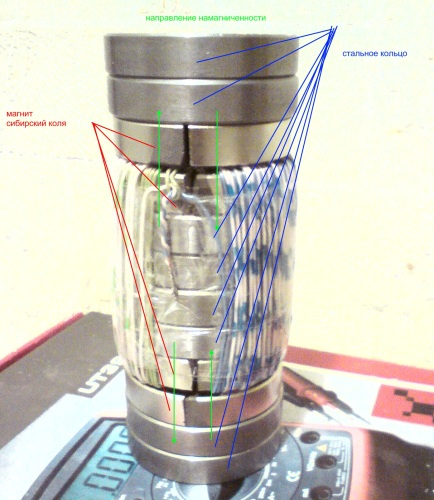 в первоначальном варианте (рис. 2,3) собрана конструкция из двух магнитов "сибирский коля" и стальными кольцами в качестве магнитопровода, для задания МП нужного направления.