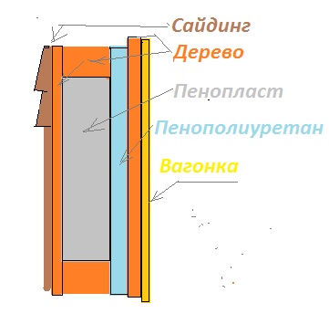 Снаружи сайтинг далее доска 2 см, далее пленка пэ, потом 10 см пенопласт, пленка, пенополиуретан 3 см, 4 см брус(доска) и 2 см вагонка