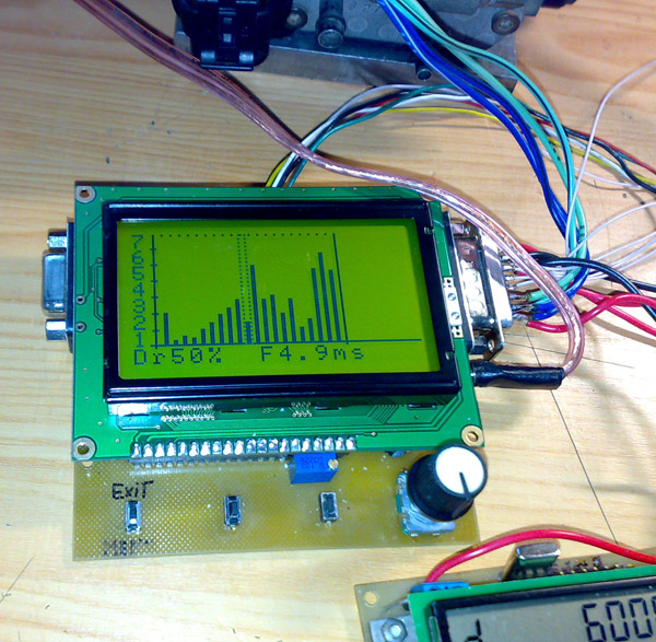 - написана пробная прошивка с возможностью отображения графика впрыска и выделением определенного столбика в зависимости от нажатия на педаль газа.
