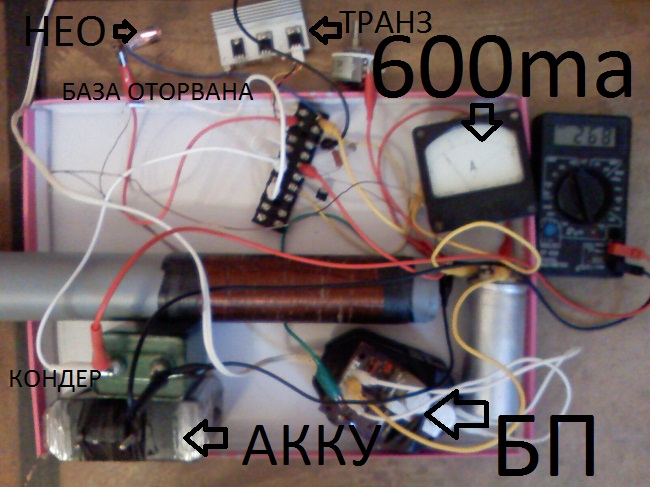 Транз лежит на расстоянии не менее 200мм от катушки. Повторил опыт при конденсаторе вместо акку. При отрыве провода от сопротивления базы - продолжается процесс, на кондере 260В. При перемещении оторванного провода (черный) к катушке процесс срывается.