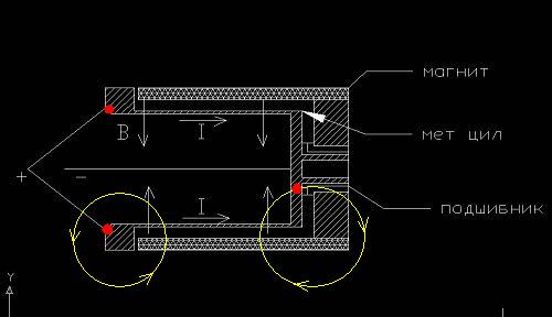 3 То Jonifer - на том форуме куда вы дали ссылку немного другой двигатель, там одна щетка расположена на цилиндре, а значит часть магнитных нитей пройдет через неподвижный проводник(отвод от щетки) а следовательно очень слабое вращение все таки будет. Магнитное поле без магнитопровода "распушается" во все стороны и часть пройдет черз проводник вращающегося цилиндра справа и тут то и будет противодействие. А на цветном вашем рисунке я показал стрелками что все время будет очень сильное противодействие, так как нет в нужном месте щеток на одном из проводников.