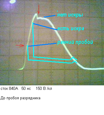 Дед посмотри на осциллограммы. Клетка 5мкс. 0,2В. при сопротивлении 1ом. При родных прокладках 0,5мм. лучший результат. Чуть заходим в насыщение, больше 20А. Искры в камере при давлении 6кг/см2 нет. Пробивает только разрядник 0,8мм. При пробое искры в камере ток доходит до 40А при разных зазорах в сердечнике. Искра не стабильная, наверно из за этого двойная осциллограмма. Так должно быть?