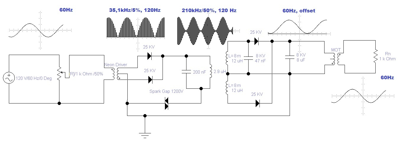 При разделении электричества потенциал негармонического электричества будет накапливаться, поэтому трансформаторы нужны высоковольтные. Они удержат ваш статический потенциал. Вспомните эксперименты со статикой, когда добавление заряда в лейденскую банку увеличивает её потенциал вплоть до напряжения пробоя (Поль "Введение в учение об электричестве" 1933). Для сдерживания статики вам необходимо иметь хороший запас по напряжению. У Смита диоды рассчитаны на 25КВ и это необходимый минимум. Приведённые ТВСки выдерживают 100-150КВ, однако, такие стат напряжения снимаются просто поднесением руки.