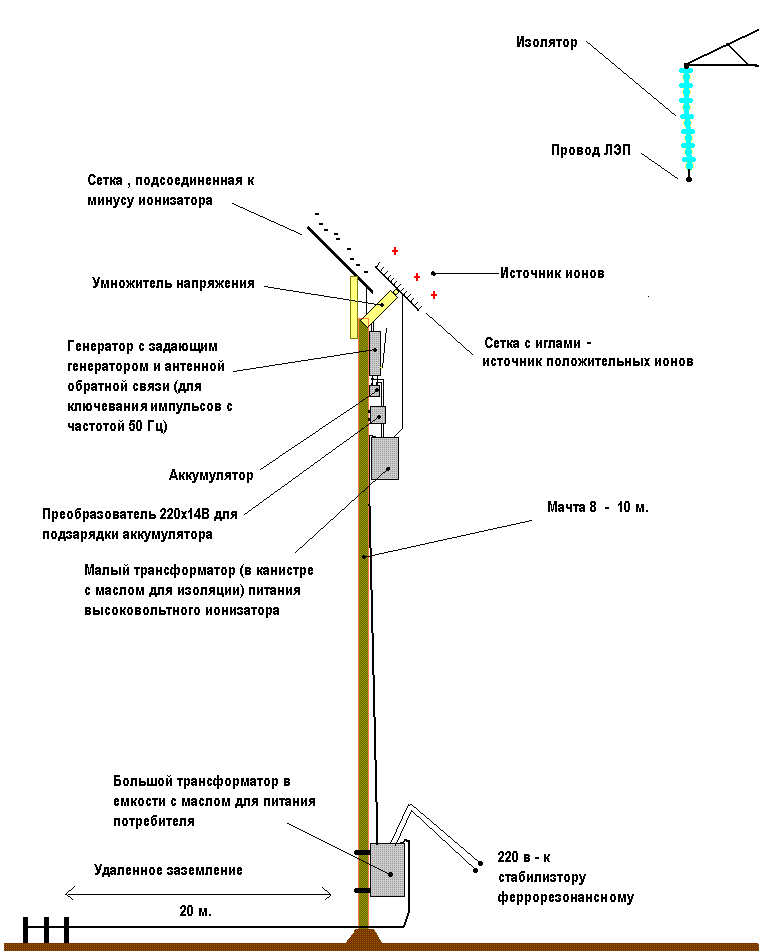 Надо не так... Дом недалеко от ЛЭП , один провод к "0" (в щитке в доме), второй к железной трубе, закопанной под крайним проводом ЛЭП . В разрыве проводов - последовательный контур на частоту 50 Гц (первичка трансформатора ,та, что на 220 вольт) и конденсатор . Одна вторичная обмотка трансформатора - к блокингу , который работает как умножитель добротности, другая вторичка - цепь обратной связи блокинга, третья вторичка - для питания этого блокинга.С четвертой вторички - питание нескольких светодиодов. Трансформаторы серии ТПП для этого подойдут...