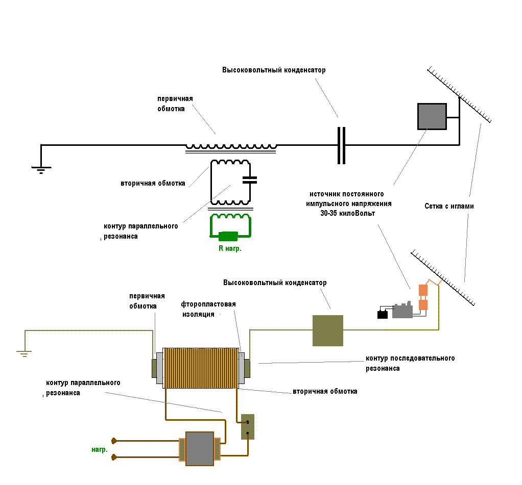Сделал как на рисунке, только антенной служит алюминиевая фольга, примерно 1,5x1 м. Это по патенту Теслы 685.957