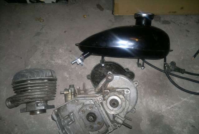 Я себе делал из огнетушителя автомобильного, крепится на раму как бутылка для воды. И карбюратор от бензопилы ставил, т.к. в родном, сцуко, поплавок сдох.