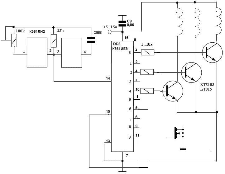 Могу предложить проверенный очень простой генератор на 10 ключей. На схеме три. Коэффициент пересчёта зависит от места подключения вывода №15 На схеме ключи включены к счётным выводам через один для исключения сквозных токов. Можно подключить и подряд, получится 10 выходов, или 5 если через один. Если мало- подключаем к выв.12 следующую 561ИЕ8. И т. д. Вместо КТ315-3102 можно на прямую MOSFET, но лучше через ключики. В качестве ЗГ можно любой другой, у меня на TL494 с регулировкой скважности и частоты. Работает от 4 вольт. Если нужно дорисую как ключами управлять MOSFETами.