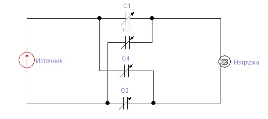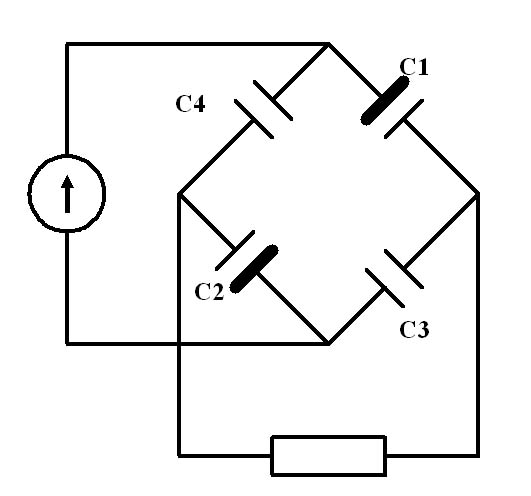 По поводу эквивалентной схемы- не нравится Вам предыдущая, вот она в виде классического моста, как мы ее привыкли видеть, утолщенные обкладки С1 и С2 есть статорные пластины, тонкие-роторные. С3 и С4 есть емкости образующиеся при заходе роторных пластин в область "чужих" статоров. Из-за симметричности Вашей конструкции видим что согласно такой эквивалентной схеме мост всегда находится в равновесии и если мощность и будет поступать из источника, то ТОЛЬКО ИЗ-ЗА НЕСИММЕТРИЧНОСТИ КОНСТРУКЦИИ. Т.е.