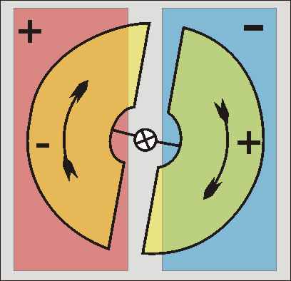Когда ротор располагается таким образом, что электроды совпадают с электродами статора - заряды в роторе "разбегаются" в противоположные стороны.