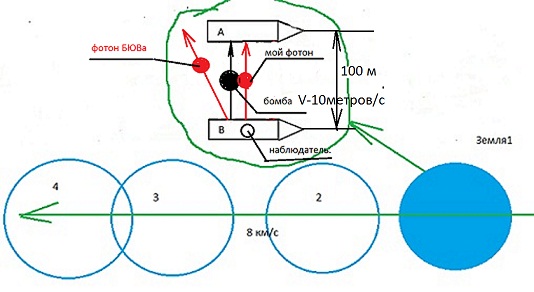 Не так.Наблюдатель на корабле,между кораблями летают бомбы,лучи,кирпичи и фотоны.Корабли неподвижны относительно Земли.Разгоняем ЗЕМЛЮ до 8км/с.Теперь скорость кораблей относительно Земли 8 км/с.