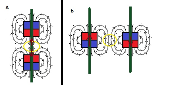 На рисунке в случае А силовые линии в взаимодействуют в желтой области и возникают силы показанные коричневыми стрелками.