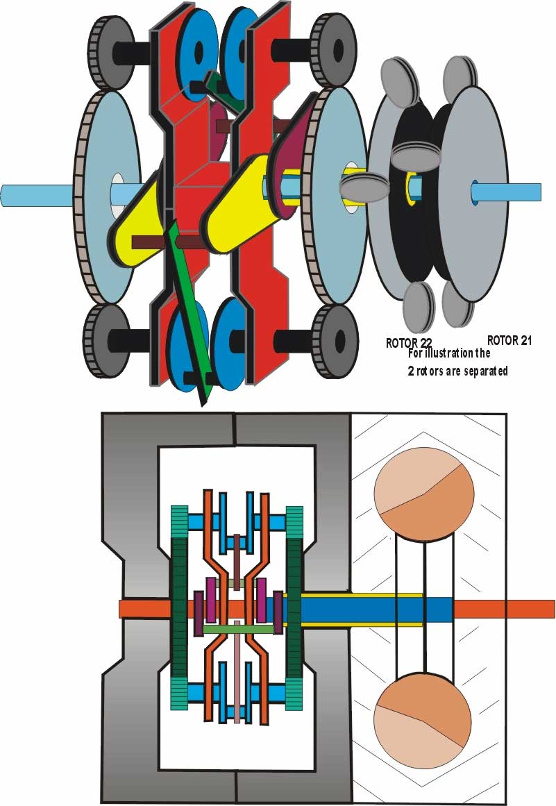 Принцип действия. В общей камере вращаются два соосных ротора. каждый ротор имеет две лопатки под углом 180. С одной стороны общей камеры зона впрыска,с лругой (со смещением) последовательно окна выхлопа и всасывания. Очерёдность работы - ротор 1 фиксирован,ротор два проворачивается на 180, в одной части камеры меду лопатками разных роторов (стоящего и вращающегося) происходят такты раб.хода и выхлопа, с другой всасывания и сжатия. Ротор два,описав неполные 180 встаёт на фиксатор,происходит впрыск и вращаться начинает ротор 1 - циклы повторяются. Секрет синхронизации и "довода " вращающегося ротора до 0 положения в блоке шестерён,представляющем из себя дифференциальную систему. От обоих роторов выходят жёстко с ними соединённые соосные вылы (один в другом),на концах которых конические шестерни. между коническими шестернями сателлиты. Отбор мощности именно от блока сателлитов, маховик на валу отбора мощности.