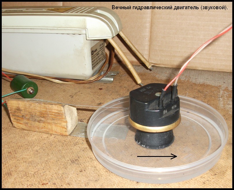 При включении динамика, от радиосети, при включённой лампе, вращение воды усилилось. Примерно в два раза. Напряжение на конденсаторе 4,5 КВ. Вечный гидравлический двигатель - вибрационный?