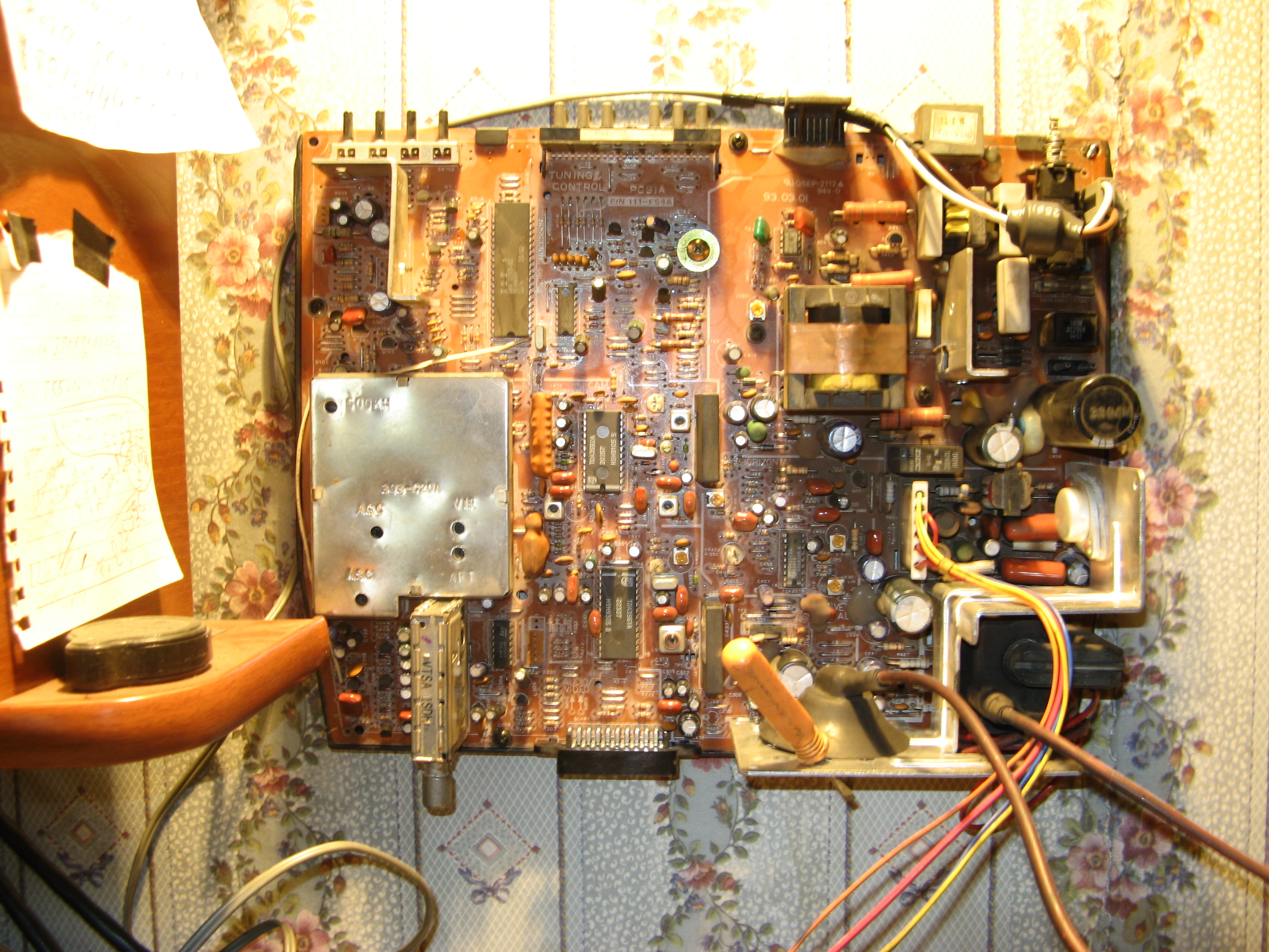 Первым делом,- стал вопрос высоковольтного источника питания. У меня валялось несколько плат от мониторов, которые распаивал на детали. Покопавшись нашел телевизионные платы, выбрав одну как мне показалось самую мощную, взял ее в качестве источника высокого напряжения. Переделав, проверил, дуга была сантиметров 6-8.