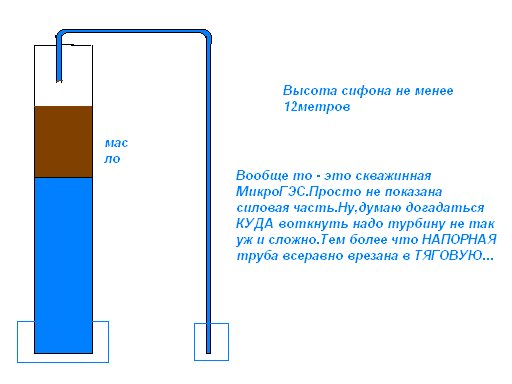 Есть большая ёмкость - так? Я так понял, что столб воды 12 метров сам себя тянет вниз. Вернее его тянет гравитмция Земли. В итоге - в верней полоси, над маслом, образуется разряжённое пространство. Т.е. давление в ней гораздо меньше чем атмосферное на уровне моря(если соблюдать терминологию). В силу этих причин, вода из "тонкой" трубы будет поступать в эту самую полость. Хрен с ним - будет "уступать место для более плотной материи-энергии", если тебе, Владимир, так нравится. Суть от этого не меняется.