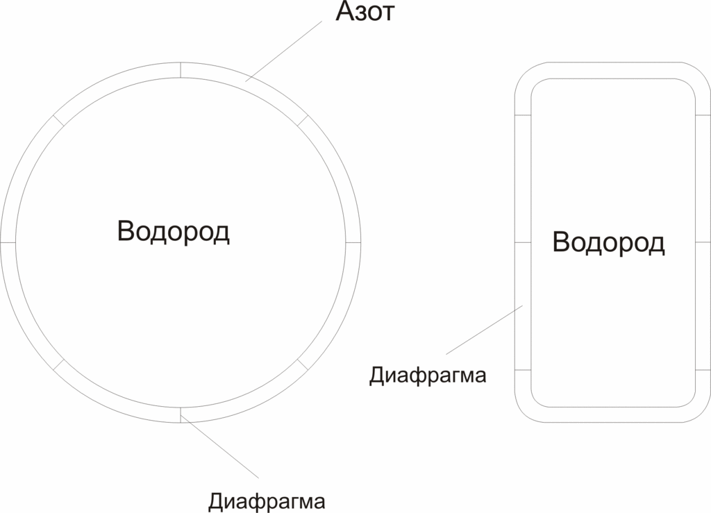 Обратимся к рисунку, на котором представлен проект водородно-азотной газовой системы жёсткого дирижабля. На рисунке изображён цилиндрический газовый баллон жёсткого дирижабля. Баллон содержит две оболочки. Полость между ними имеет внутри радиальные диафрагмы, делящие её на восемь отсеков. Отсеки заполняются инертным газом – азотом. Внутренний цилиндрический баллон заполнен водородом и посредством шахт и клапанов сообщается с атмосферой. Таким образом, отсек с водородом со всех сторон окружён инертным газом, который не даст водороду смешиваться с воздухом. Плотность азота – 1,25 кг/м3 – несколько меньше чем у воздуха, но грубо можно считать, что заполнение полости газообразным азотом равнозначно её заполнению воздухом. Однако при этом исключается образование гремучей смеси во внутренних помещениях дирижабля.