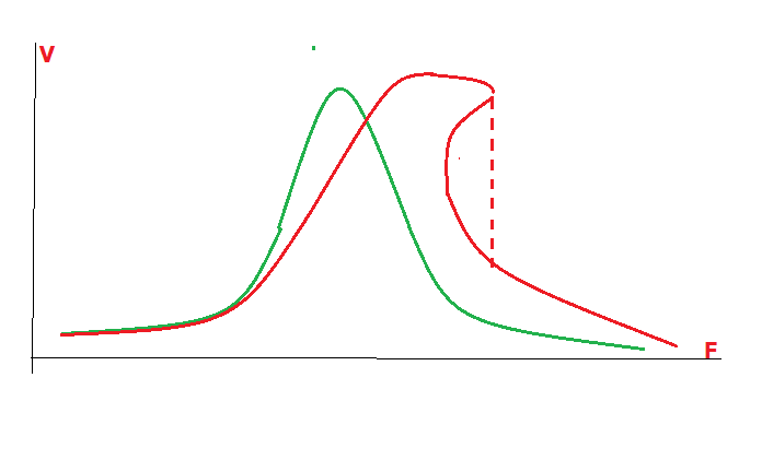 С ростом напряжения на контуре емкость уменьшается и растет частота, получается верблюжий горб.