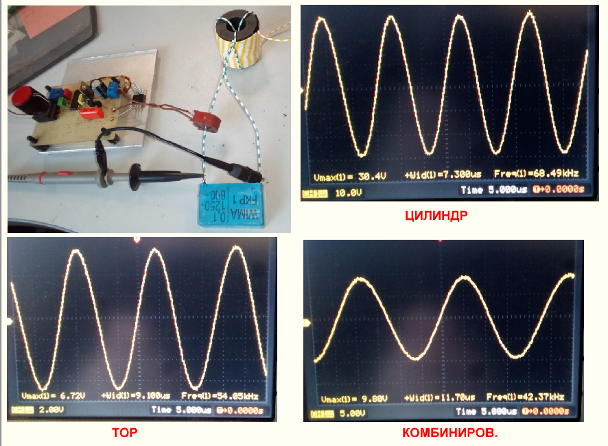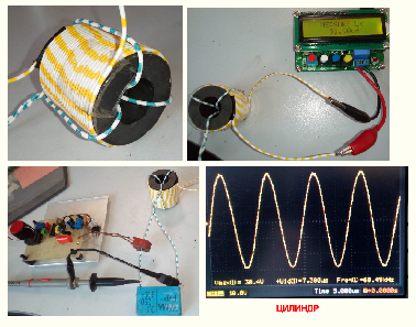 Для закрепления результата (т.к. измеритель индуктивности считает косвенно) был собран колебательный контур с конденсатором 0,1 мкФ и с помощью генератора найдены частоты резонанса для всех трех случаев.