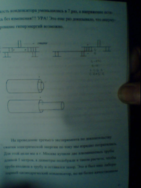 На основании проведенных эксперимкнтов мы создали машину времени на которой возможно перемещение во времени не только в прошедшее, но и в будующее. Эта установка представляет собой, где верхние усеченные пластины пирамиды соединяются между собой медным проводником, а нижние электропроводящие пластины подсоединяются только к мощному электростатическому генератору. Эксперементальные опыты показали. что напряжение на площади в 1м2 емкости С1 и емкости С конечное площадью 1 см2 были равны. Это и был огромнейший парадокс в области статики, где между любыми параллельными пластинами сохранялся не заряд, а энергия. На протяжении 8 ми лет мы проводили эксперименты которые доказывали, что при заряде пирамид сохранялась формула, что между параллеными пластинами сохранялся не заряд, как учат в учебниках физики, а энергия сохраняется в паре параллеьных пластин независимо от их площади, что нас и привело к созданию машины времени при помощи электростатических пирамид. Экспериментальные опыты показали, что только в верхней части пирамиды образуется сжатие электрической энергии во времени и только из острия можно производить выброс энергии в виде шаровой молнии, либо искровых молний, действующих на большие расстояния, что и было опубликовано в моей книге "А.К.Гапонов О вечных двигателях, антигравитации и шаровых молниях" изданную 29.04.2004г. Мною проведены эксперементальные исследования из 10 ти пластин пирамиды, где нижняя пластина представляла собой 1 м2 на которую был нанесен изолятор , где каждая последующая пластина уменьщалась на 1/10 площади предыдущей пластины, в результате чего на всех паралленых пластинах обнаруживалось одинаковое напряжение, что по существующим законам электротехники быть не должно. Настоящие данные могу подтвердить экперементально - А.К.Гапонов.