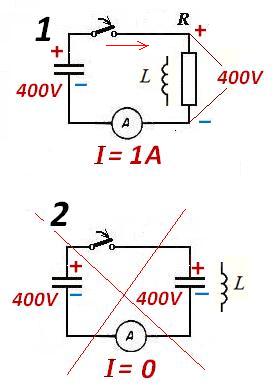 Вот смотри. Если заряженный конденсатор подключить резистору, то вначале на резисторе тоже будет 400вольт. Потом разрядится естественно. Я думаю что, тут ты не скажешь что этот 400вольт принадлежит резистору и в цепи не будет тока. Именно так происходит и в КК. А ты хочешь подсунуть нам свой, неверный вариант, (рис.2) где обе элементы, и L, и C является источником одновременно и ток в цепи =0
