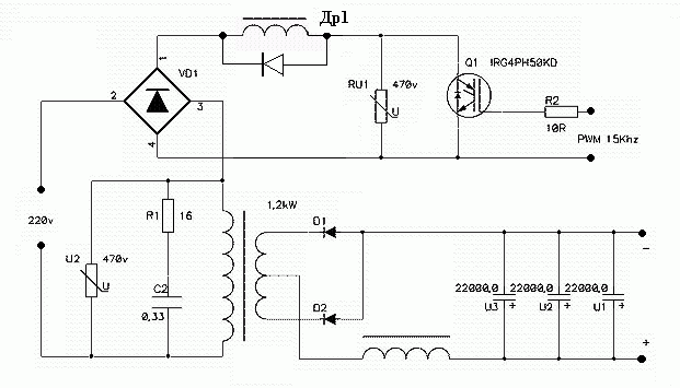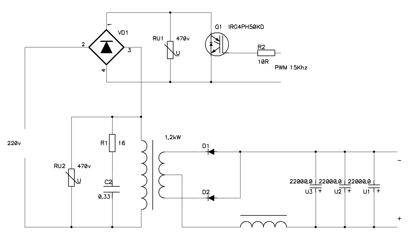 Транс 1,2 кВт. Индуктивность его 0,48гн. Вых напряжение 30в, ток до 40А.